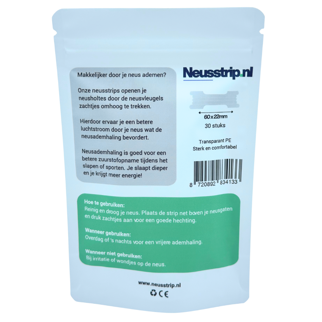 Onze neusstrips helpen je om makkelijker door je neus te ademen, doordat de neusvleugels zachtjes omhoog worden getrokken. Dit bevordert een betere luchtstroom en zorgt voor een diepere ademhaling, of je nu in bed ligt of intensief aan het sporten bent. Geniet van een betere zuurstofopname, een diepere slaap en meer energie!